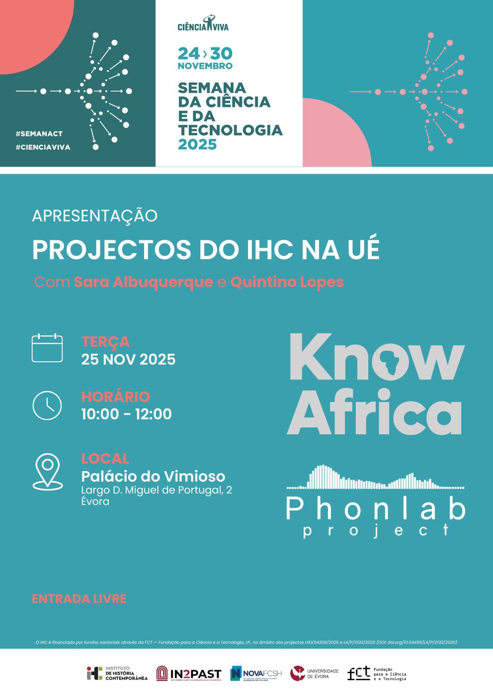 25nov10:00 am12:00 pmApresentação de projetos do IHC na Universidade de ÉvoraSemana da Ciência e Tecnologia10:00 am - 12:00 pm Universidade de Évora, Palácio Vimioso, Largo de Dom Miguel de Portugal, 2 — 7000-654 ÉvoraTipologia do Evento:Apresentação
